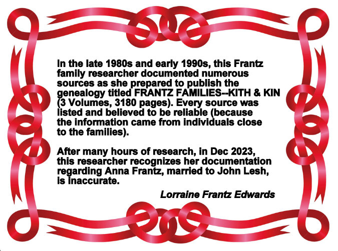 Yes, I have rarely left the computer since about seven this morning and it is now after eight at night. Too engrossed to go downstairs for breakfast, lunch, or supper!! On the positive side: An enormous dose of “my medicine” (climbing the family tree). Gratefully, I resolved the problem of two women with identical birth and death dates. Hours of searching plus numerous images created to draw attention to the correct information. The identical dates were published (in 1996) in my book titled FRANTZ FAMILIES–KITH & KIN.