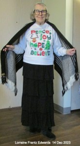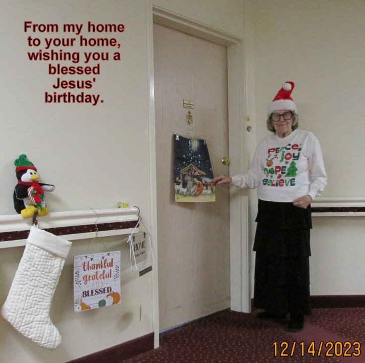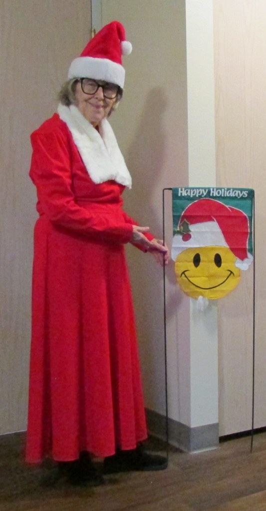 POSTSCRIPT: “Never put off until tomorrow (or later this month) what you can do today.” I set up the camera and took a dozen pictures before I was satisfied with the Mrs. Santa picture. The Smiley Face garden flag was a gift (in 2010), from a dear lady friend.