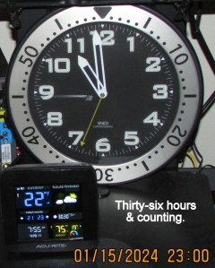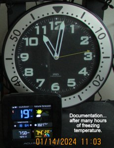 Twenty-two hours and counting This old lady has not ventured outdoors. I’m warm, and cozy, in my apartment. If still in the RVPark (like a year ago), I would be concerned about frozen water pipes and the amount of propane in the tank. ~ ~ ~ ~ POSTSCRIPT: FYI Share this: Click to share on X (Opens in new window) X Click to share on Facebook (Opens in new window) Facebook Like Loading... Related Leave a comment Cancel reply Δ