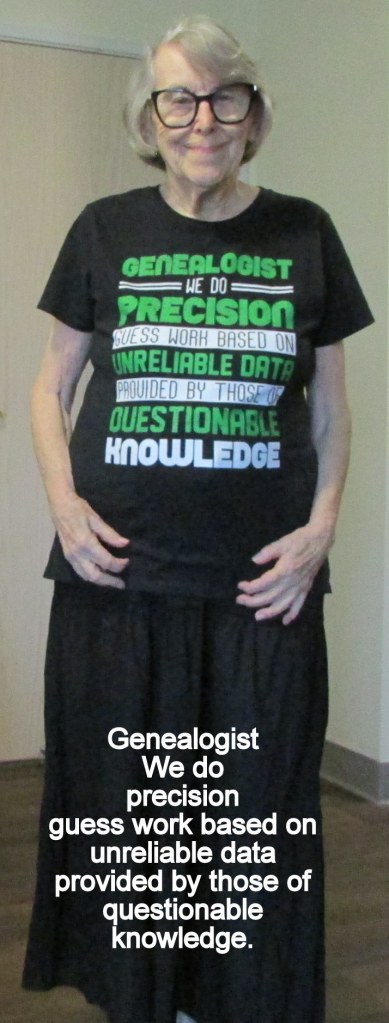 Cousin conversation For Christmas, one year, my biological cousin—and E–mail genealogy pal—sent me this T-shirt. ~~ WE have a great hobby!! Share this: Click to share on X (Opens in new window) X Click to share on Facebook (Opens in new window) Facebook Like Loading... Related Leave a comment Cancel reply Δ
