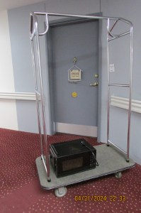 Unfortunately, nobody was following me to make a video. It would have been amusing. Lakeshore Estates is getting new (used) dining room furniture. My friend, Molly, wanted one of the tables and chairs for her apartment. We consulted the Executive Director Manager and he said “OK if one disappears.” ~~ At ten o’clock Sunday night, I went to the dining room and started the Herculean task. The table was terribly heavy and awkward to get on the cart. Unfortunately, I didn’t think to take my camera when I approached the task. See “the cart” in the picture with the microwave. “X” marks the spot where the table was removed. Then the “almost impossible” job of getting the table and cart into the elevator—and out of the elevator (all by myself). Mission accomplished: First the table and then four chairs. My friend, Molly, sent me home with a new microwave because she had two (and I had none). I praise God for my ability to “do” for others!!