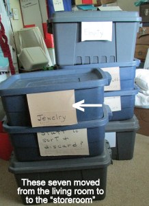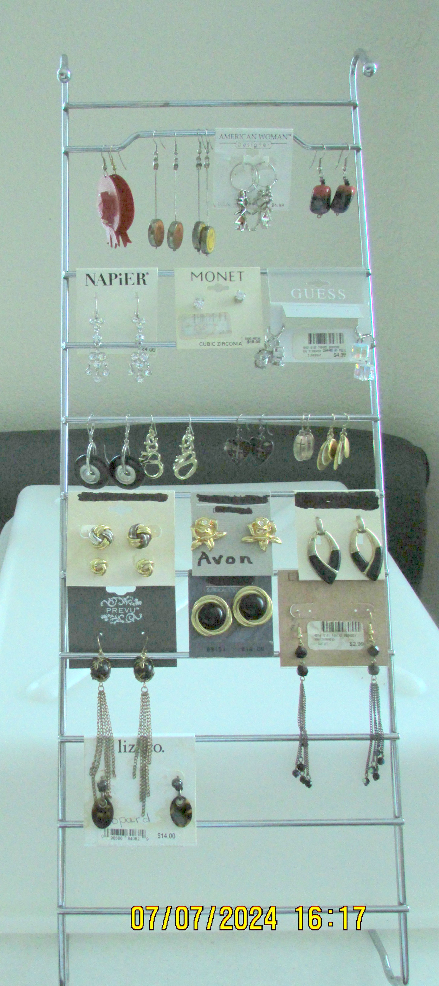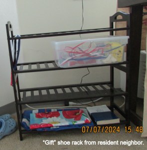 As demonstrated in a couple of earlier blog messages, I am gathering things for a donation to a local charity. In the process of “gathering” from residents who are moving, I am “working my way through” my vast amount of items in my “storeroom” (otherwise considered a bedroom but my bed is in the living room). I positioned two furniture pieces… and then I began the enjoyable task of unloading the tote full of jewelry. I have not looked at those items since I left North Carolina in October 2013. I was able to fashion a rack to display my earrings. (I’ve seldom worn earrings the past four-and-one-half years because I was a hermit.) Now I will coordinate my earrings with my wardrobe. Each day—mingling with other residents—will be a “mini-costume” event. (Ha ha!) Did you question why I blocked the air-conditioner? I do not like “air” blowing on me!! Now the air is going to the left, right, and floor. ~~ Yes, the residents gave me permission to keep the furniture items “if you want them.”