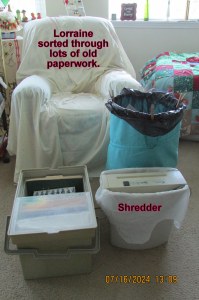 “Old lady Lorraine” is still “under the weather.” A lot of time is spent in the comfort of the recliner. As energy permitted, very old paperwork was sorted and discarded. In the bedroom AKA “storeroom,” items are sorted and many placed in boxes for a local charity.