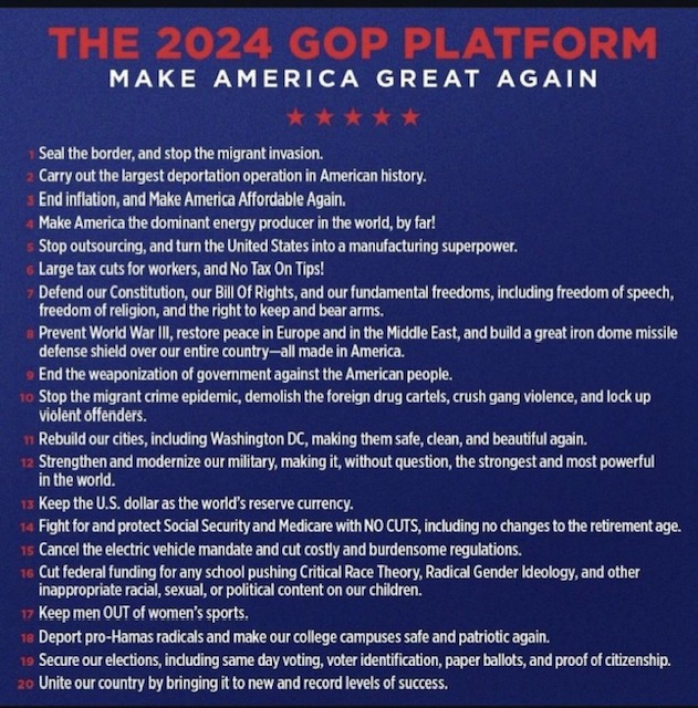 2024 GOP Platform Make America Great Again Share this: Click to share on X (Opens in new window) X Click to share on Facebook (Opens in new window) Facebook Like Loading... Related Leave a comment Cancel reply Δ
