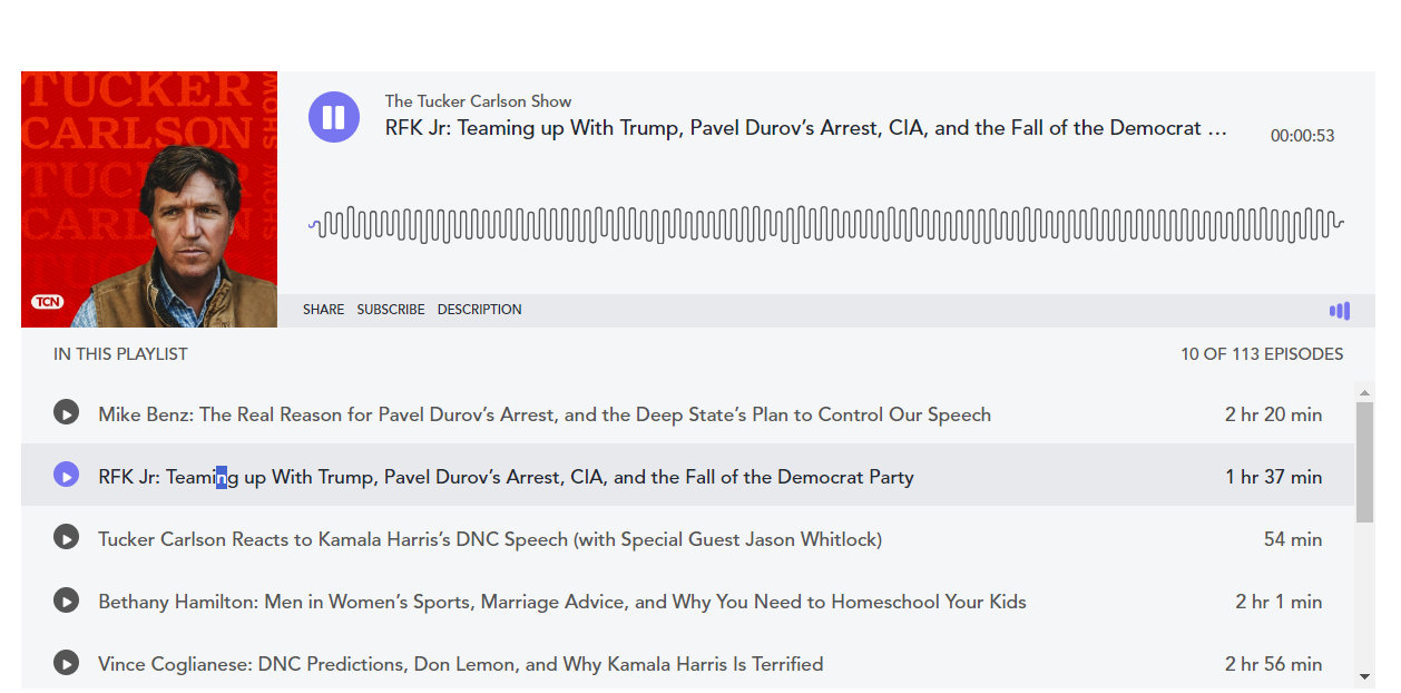 Tucker Carlson interview with Robert F. Kennedy Jr. Tucker Carson Interview with Robert F. Kennedy Jr. Share this: Click to share on X (Opens in new window) X Click to share on Facebook (Opens in new window) Facebook Like Loading... Related Leave a comment Cancel reply Δ