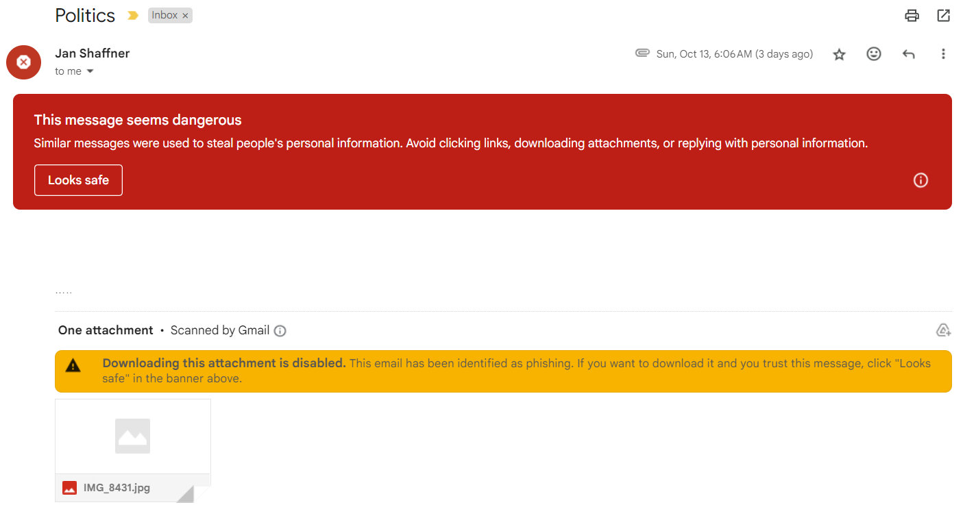 FREQUENTLY, this is the image I receive when friends send political images to me. Click on the image to enlarge it for better viewing. Google did it (because Google is my email provider).