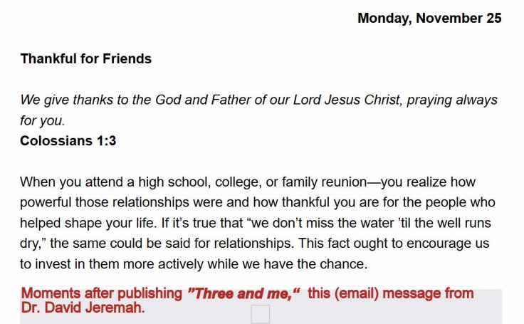 Praise God from Whom all blessings flow !! This message from Dr. David Jeremiah, and heartfelt messages (images) from Lorraine. POSTSCRIPT, 26 Nov 2024: The messages change with each day so, regrettably, you won’t see the message I was sharing with the reader. Share this: Click to share on X (Opens in new window) X Click to share on Facebook (Opens in new window) Facebook Like Loading... Related Leave a comment Cancel reply Δ