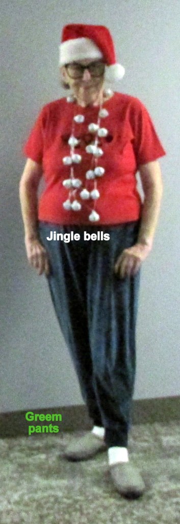 Unfortunately, the green pants are a disappointment. I was planning on Christmas colors. Should I swap out and wear a white skirt? ~~ I wore this to the dining room for dinner—and got lots of laughs because the bells really do “jingle.” (That’s why I do it.)