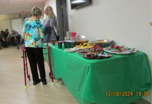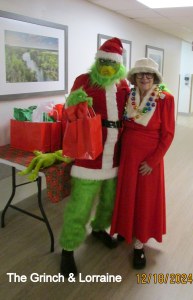 Management requested “Mrs. Santa” for an activity today. I was told Santa and the Grinch would be guests at the Christmas party. The day started with Lorraine in the requested apparel. It was nine hours before my desired pictures with Santa and the Grinch. Click on each picture to enlarge it for better viewing.