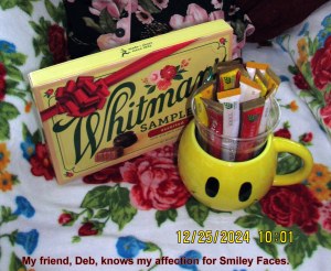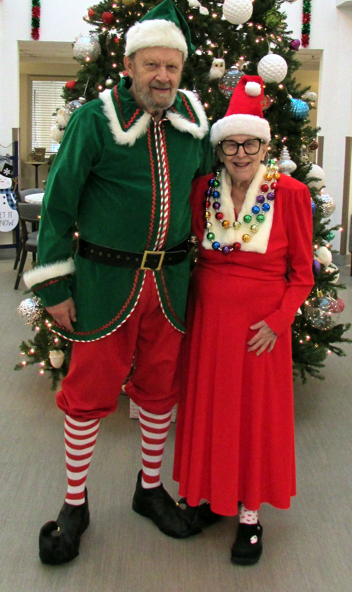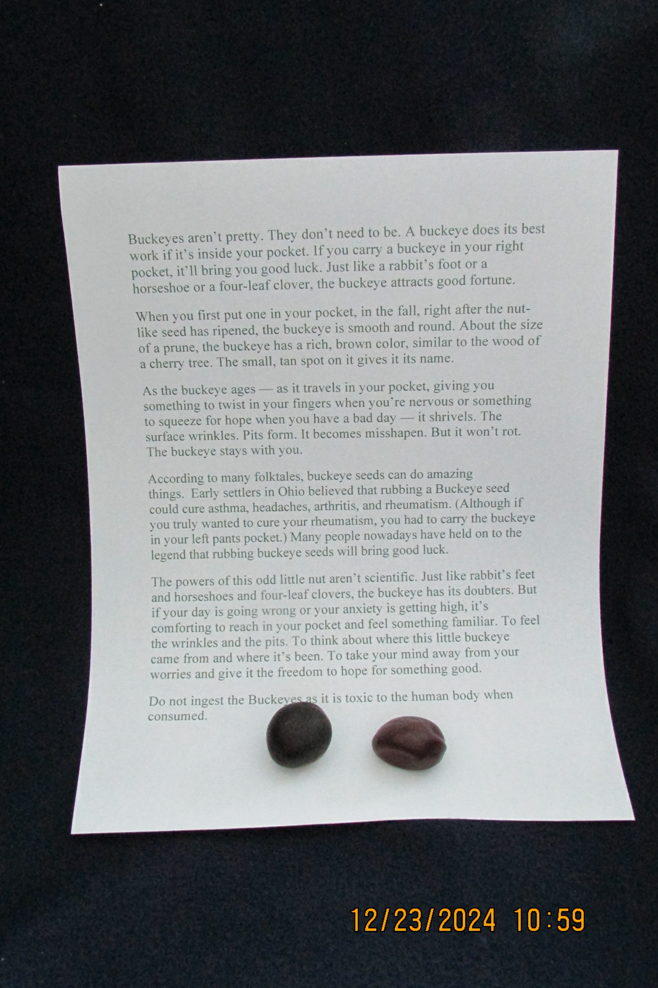 “Much ado about nothing” ( 🙂 ) but this is my JOURNAL and I want to share my recent pleasant experiences. The Christmas poem proved to be a better “gift” than Christmas cards. I gave away fifty copies and received at least one–hundred–fifty “thank you.” ~~ The Rooster jigsaw puzzle looks great in a resident’s apartment. Brenda’s happiness is my joy! Two small Buckeye seeds are a thoughtful gift from a resident friend. Mike, a near neighbor, dressed as an elf, which made me very happy because (to date) I’ve been the only person to “dress” for special occasions. I’m eternally grateful for gifts from out-of-town friends.