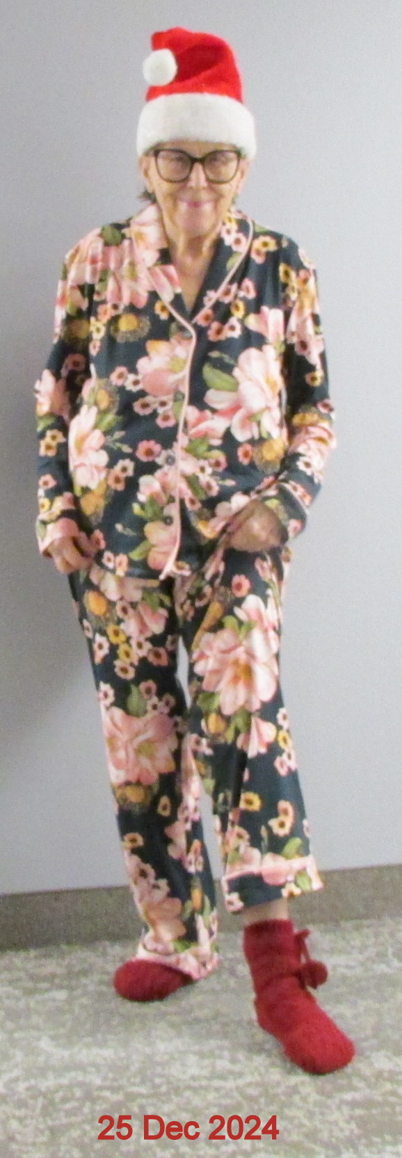 Bedtime in my new BEAUTIFUL LUXURIOUS pajamas. See the wonderful slipper socks. SINCERE THANKS, Jan.