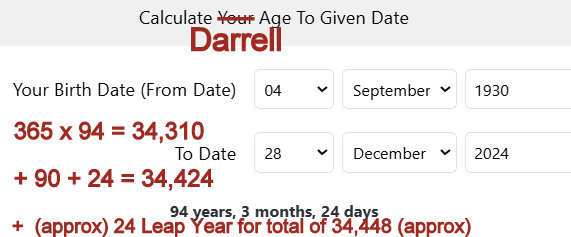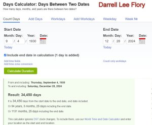 It was very peculiar to see an obituary published with the number of days versus the actual birth date. This “detective” was intrigued and did a Google search for an “age calculator.” My first search did not provide the date listed in the obituary. A second search confirmed the published information. Several of my genealogy cousins agree with me that we have never seen information in this format.