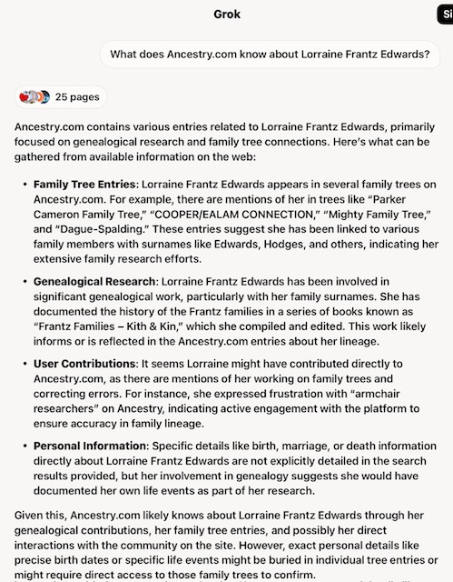 A dear friend knows I am obsessive-compulsive and thoroughly addicted to “climbing the family tree.” She wondered what she would learn about Lorraine if she did an AI search. The first image (below) is the information she received. The second image (below) is the information I located.