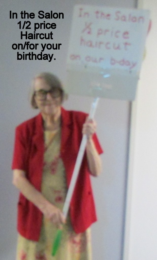 Yesterday, I ventured down the corridor to the beauty salon to request a haircut appointment. Shannon had a cancellation and could see me right away. To my surprise, residents pay half-price for a haircut on or near their birthday. Pleasant surprise; “good news.” Today I paraded around the dining room with the sign advertising the bonus for the Seniors. The residents would have noticed, and commented on, my haircut so I did some advertising for Shannon. ~~~~ “Crazy” and “stupid”?! ~~~~ (Failed as a photographer, too. I should have taken several… [as I usually do]. “Old lady Lorraine” discovered her “goof” in the photo gallery just before preparation of this message.) ~~~~