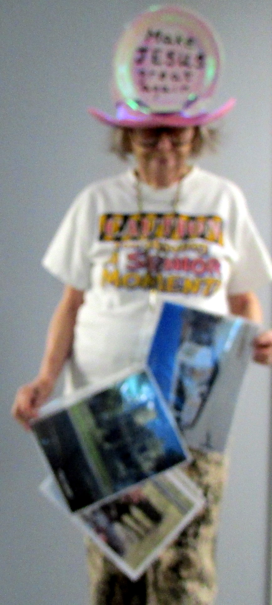 Two days and “no climbing trees.” No Ancestry/ancestry. Today I worked on two projects relating to activities at our retirement home. Two or three times a month, our bus driver gives us a tour around the city of Waco. Sadly, only two or three of us are participating. It is my goal to do some advertising in an effort to get more participants. It took several hours to hang the pictures on a necklace and create the display. I will be a walking and talking billboard. Why did it take so long? I knew I should reinforce the holes on the page protectors. Then (perfectionist that I am) I had to get the pages appropriately positioned. Fuzzy picture because my old camera is tired of taking pictures of Lorraine having another “Senior moment.”