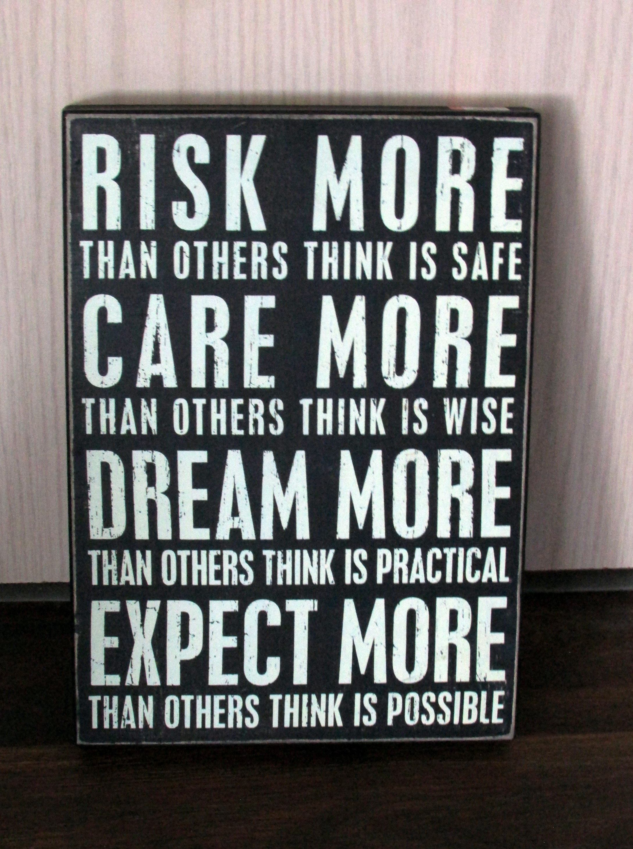Risk more The “Risk more” sign is on display in a conspicuous place in my apartment. Frequently, that sign is the shove to get me going. Share this: Click to share on X (Opens in new window) X Click to share on Facebook (Opens in new window) Facebook Like Loading... Related Leave a comment Cancel reply Δ
