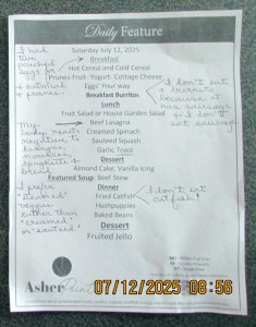 The day started with a positive routine: (1) up early, (2) dressed, hair combed and teeth brushed, (3) walk to the dining room, after taking my small bag of trash to the big dumpster. Didn’t order the “Daily Feature.” (See my written comments on the menu. Click on the image to enlarge it so “readable.”) Later: Hiked two flights of stairs to my room. This is where I will spend the day because I’m “shoving” the noon and evening meals aside. Maybe I’ll do some laundry? Most likely: I’ll “climb the family tree.”