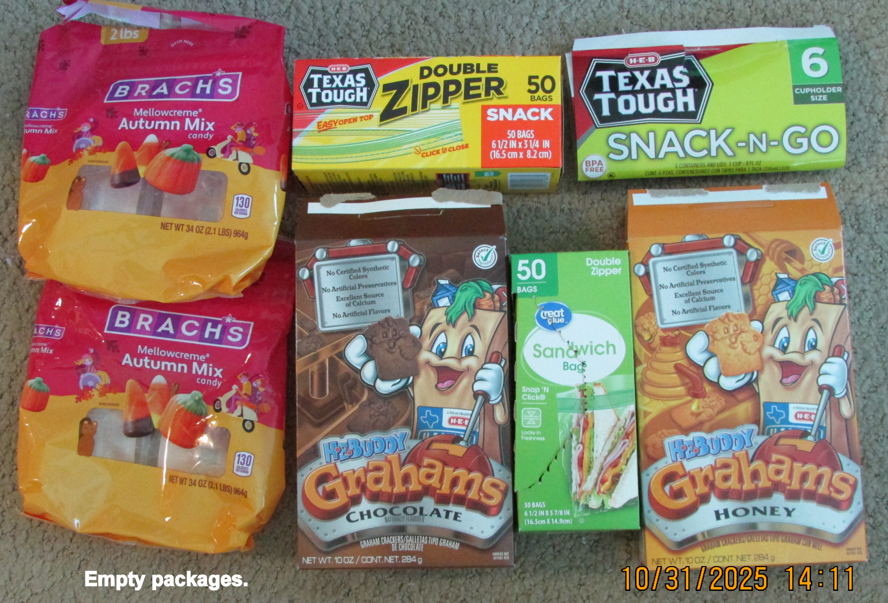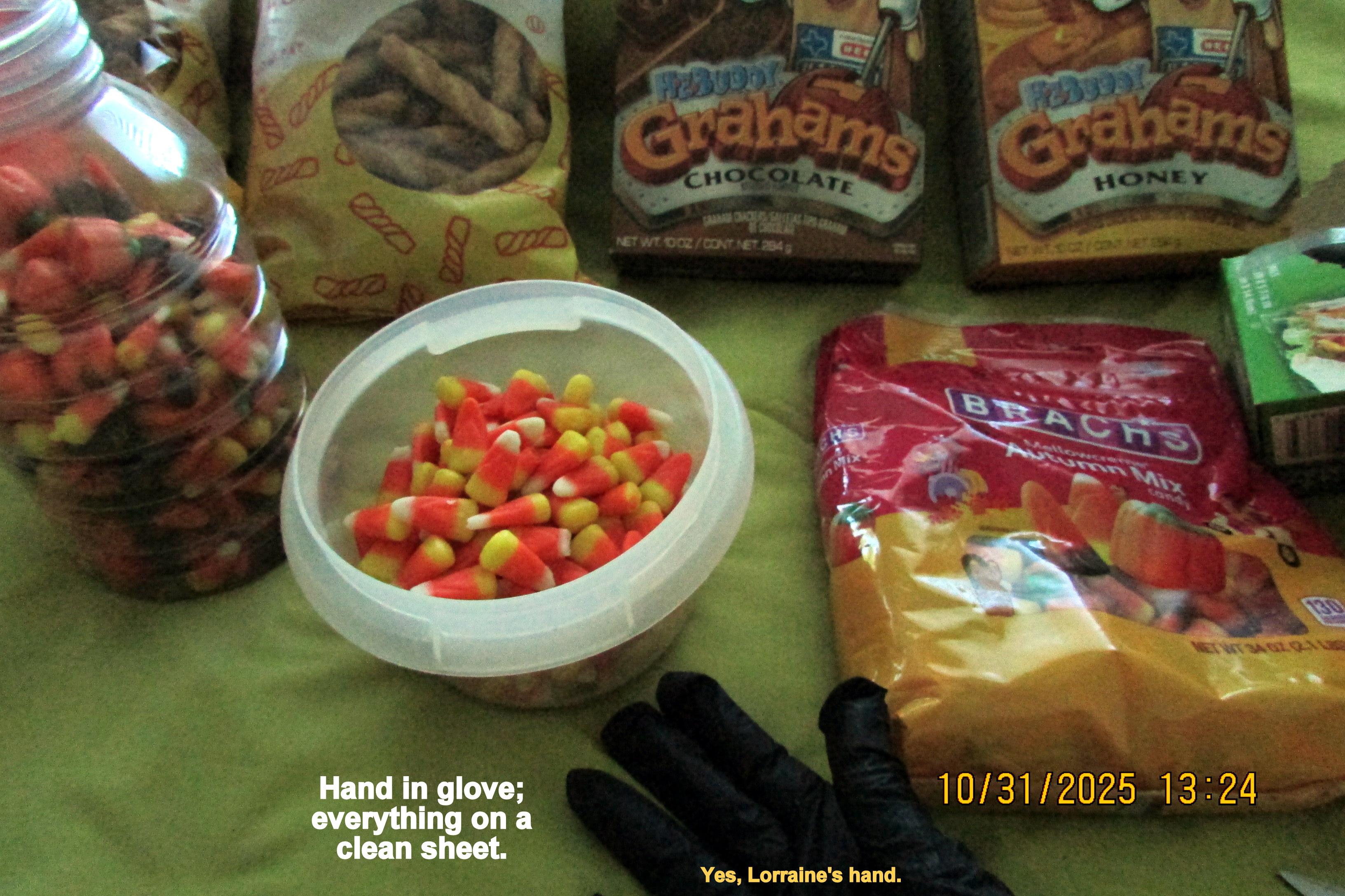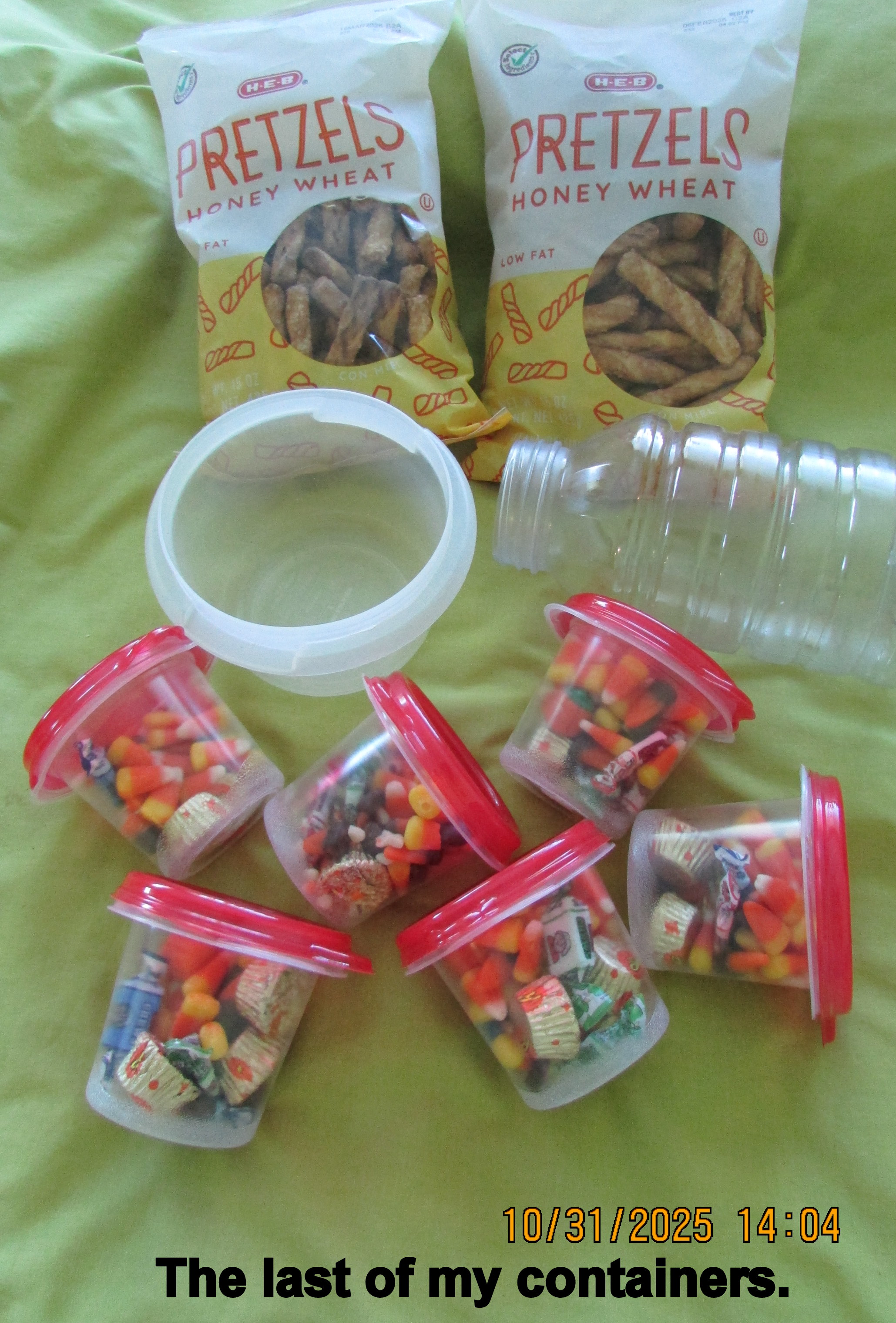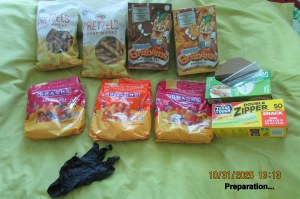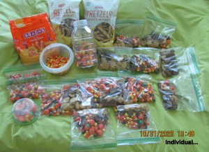 “Old lady Lorraine” was well received. Truthfully, I expected finger-pointing and comments like “crazy old lady.” The edible treats had dwindled down to very few, so I spent a couple of (afternoon) hours preparing more items. From previous shopping trips, I was well-prepared, hoping the residents would accept the treats. One lament: I don’t have packaging for the pretzels. ~~ Click the pictures to enlarge them for better viewing.