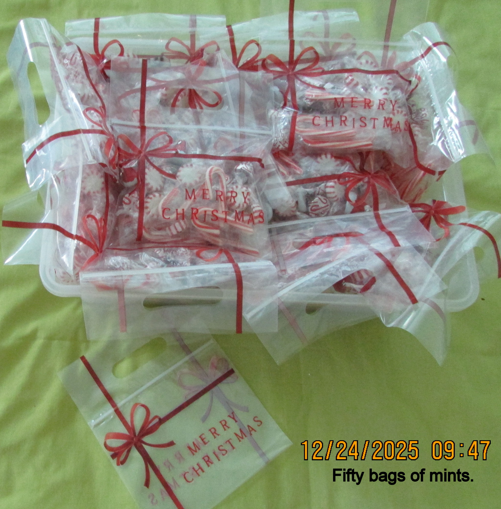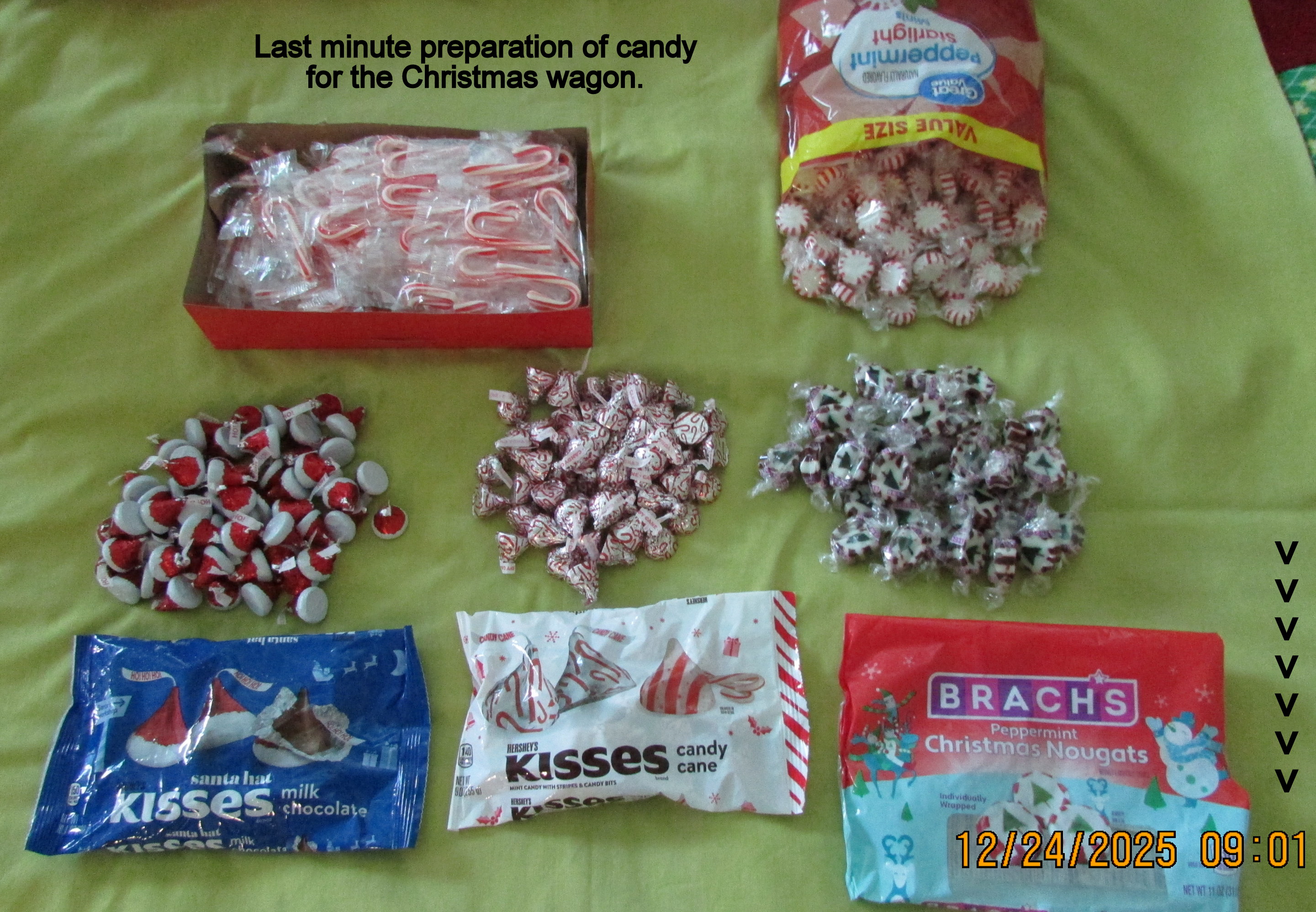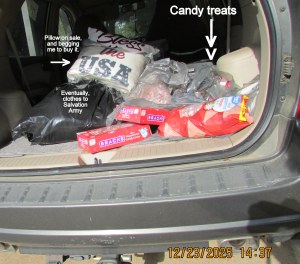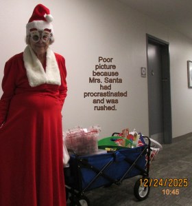 More pictures later in the day; hopefully a “better” image of Mrs Santa. Heading to the dining room (about 11:20) with the wagon load of treats.