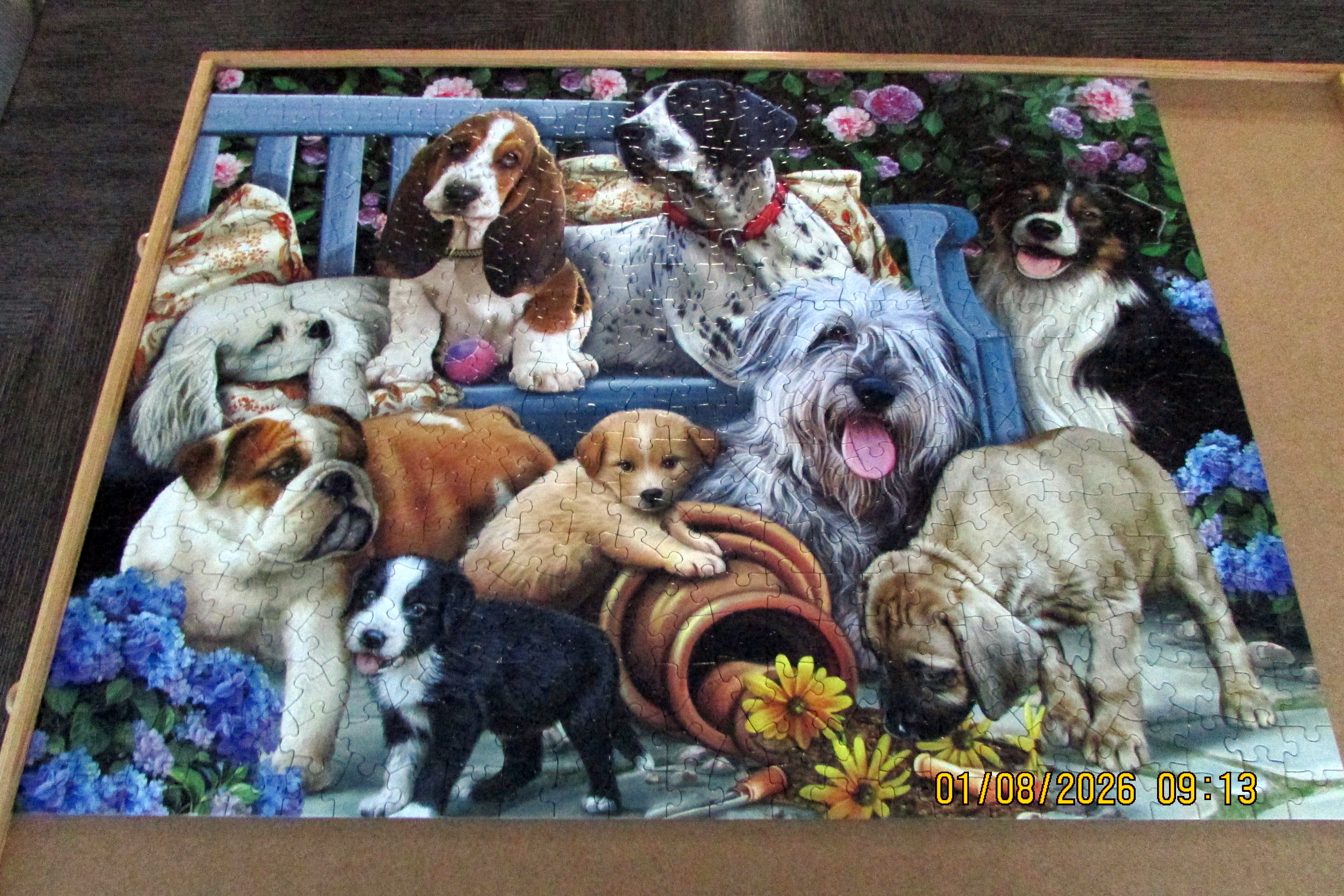 Sheila is an artist in the assembly of jigsaw puzzles. Look! The dog puzzle was completed in two days. Sheila has “magic hands.” ~~ Yet to be determined: Will we “save” this puzzle, also? I wish the owners would allow us to display the puzzles in the public areas, but the answer was a loud emphatic “NO.”