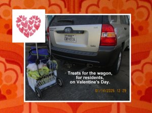 Really BIG day yesterday. Tim took me to his favorite Dollar General so I could start assembling treats for the wagon, for the residents, for Valentine’s Day. I loaned my KIA to Tim, and he will take me shopping anytime that I ask. True story: I am terrified of Waco traffic; the drivers are speed demons and reckless (in my humble opinion). Tim needs transportation, and I do not need transportation. The last thing “old lady Lorraine” needs is an auto accident caused by “the other guy.” It is Thursday, January 15th, and I am alive and healthy. Perhaps it will be years (?) before the “farewell” blog messages are published, announcing that I have gone home to be with Jesus, and God, my Heavenly Father. ~~ What kinds of treats? Boxes of Kleenex, coffee mugs, Oreo cookies (for “gift” ziplock bags), Valentine’s shape chocolates (just to name a few). On another shopping trip–to another store–more candy and cookies. In a nearby community, we have a store with the sign “DG Market.” It is as BIG as some Walmart stores and (perhaps) as much merchandise as a Walmart store. (Click each image to enlarge it for better viewing.)