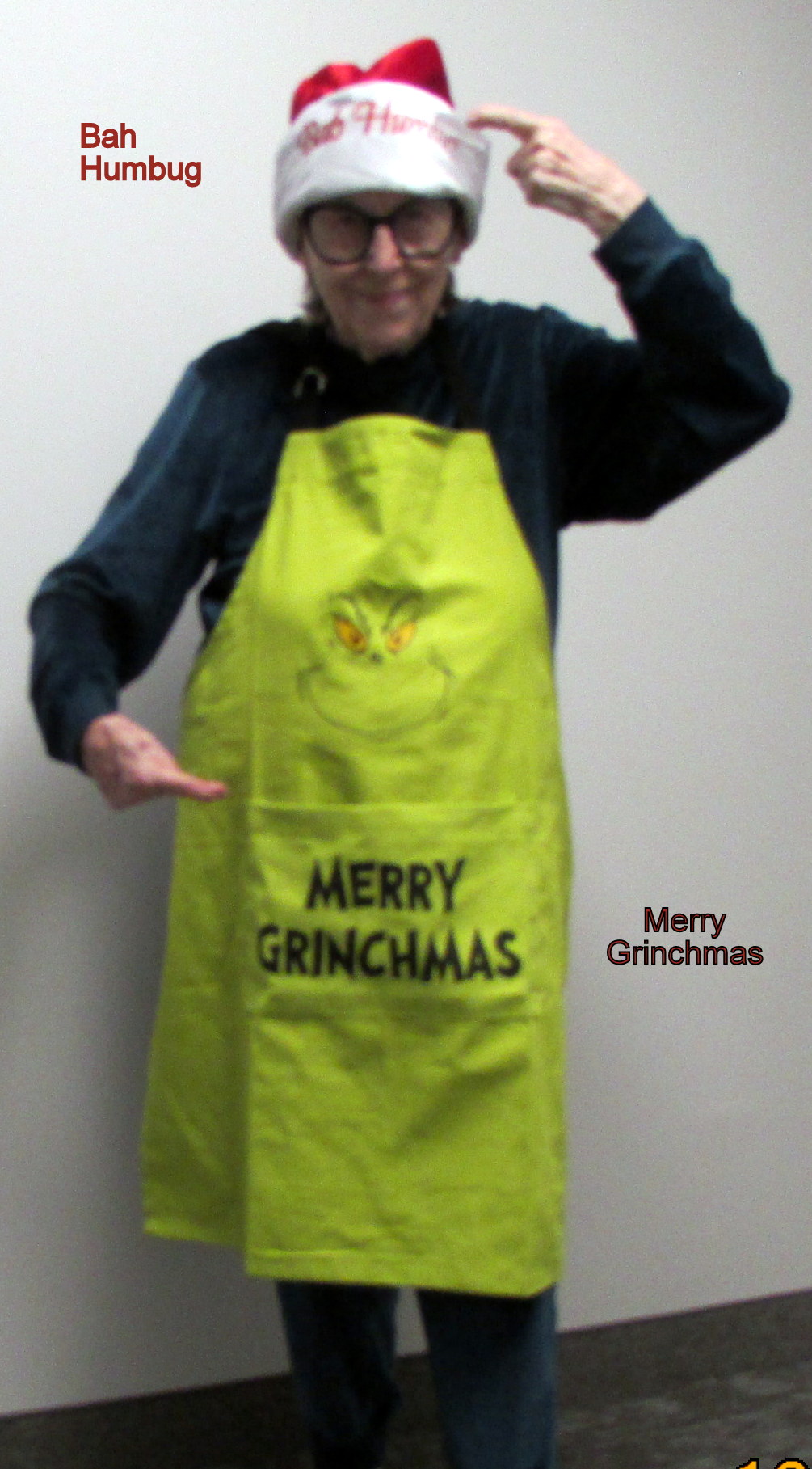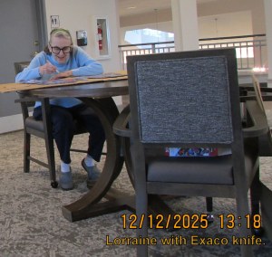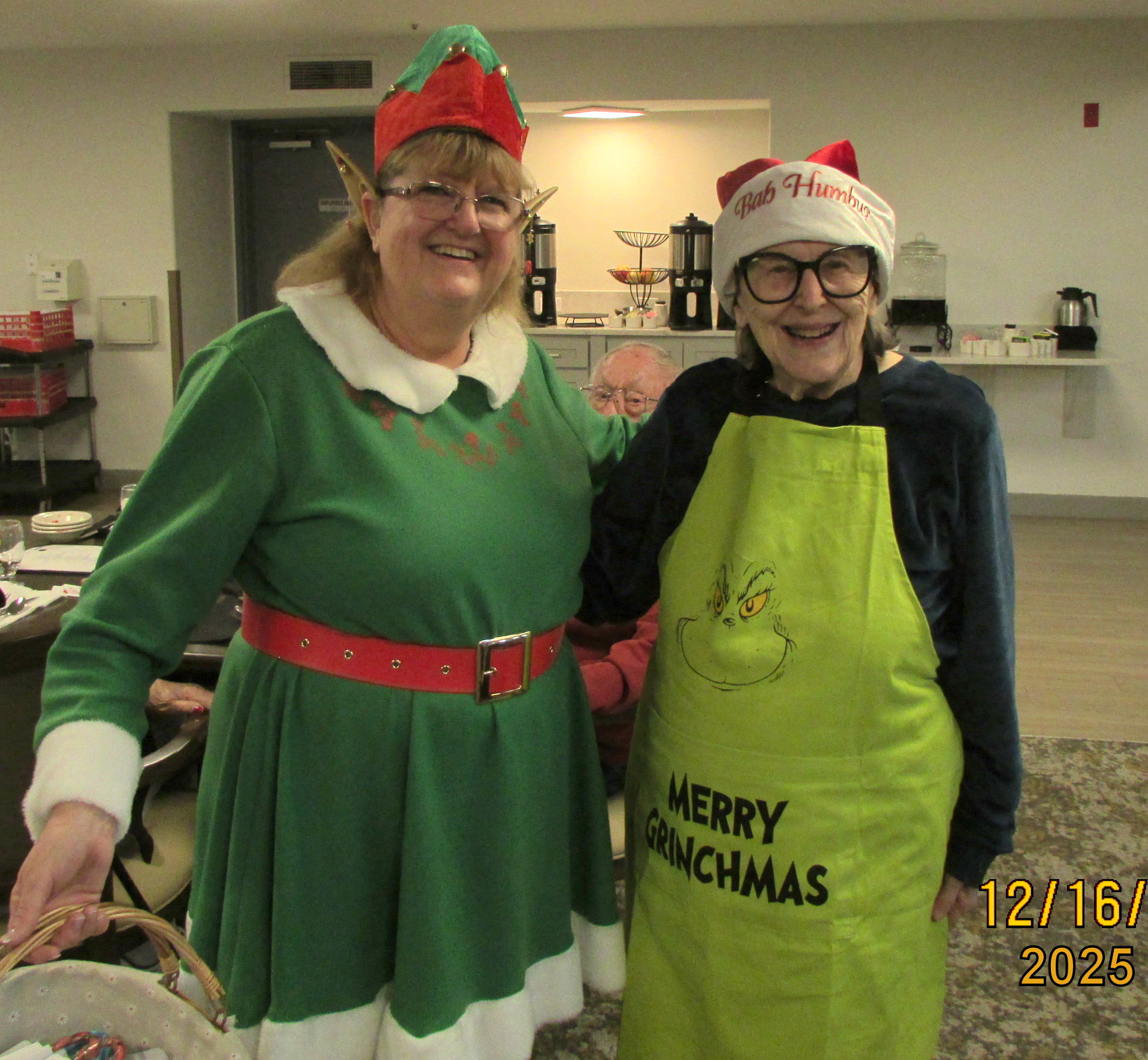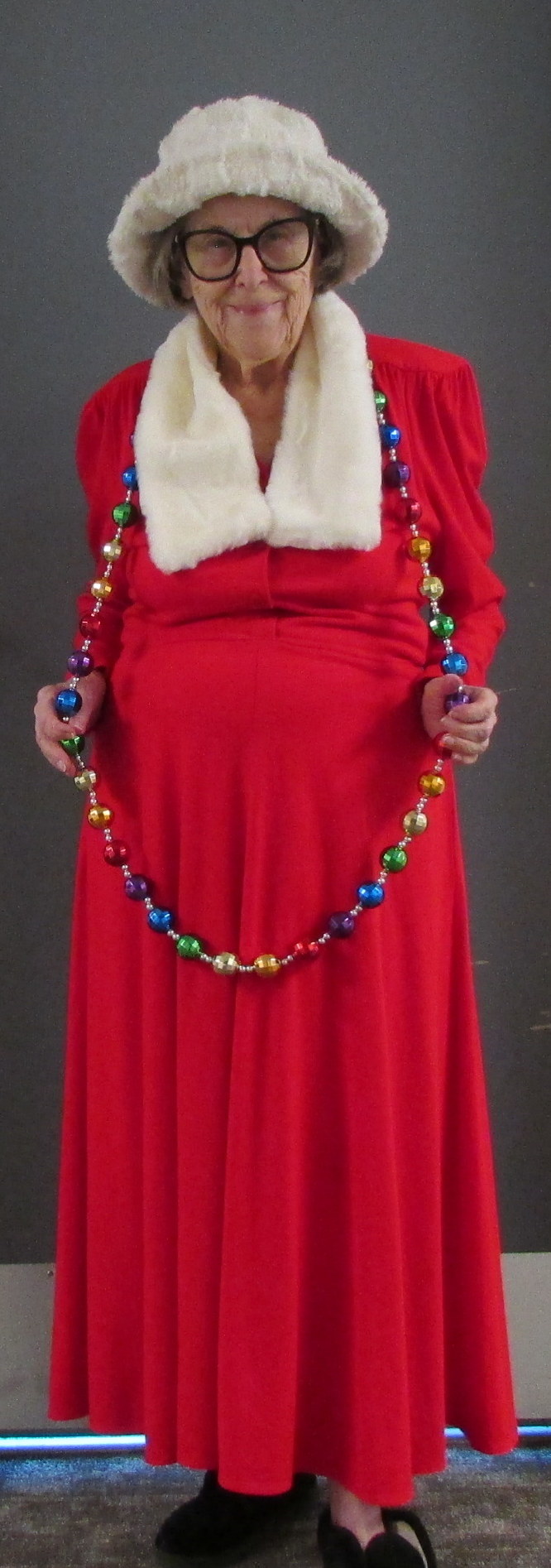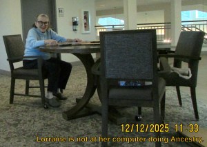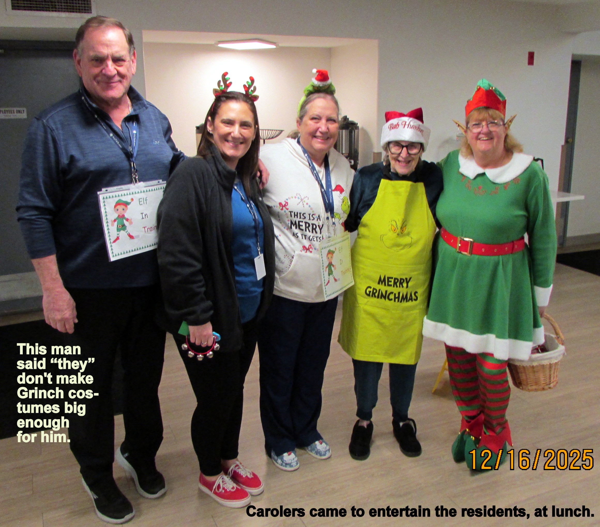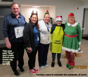 Sometimes Lorraine refers to herself as “little old lady.” It appears that Lorraine is “little’ when compared to the younger ladies. ~~ Residents frequently refer to Lorraine as “the crazy lady.” The costumes inspire a lot of laughs, and that is why I make a spectacle of myself! We need laughs, and “caring folks” like the visiting carolers.